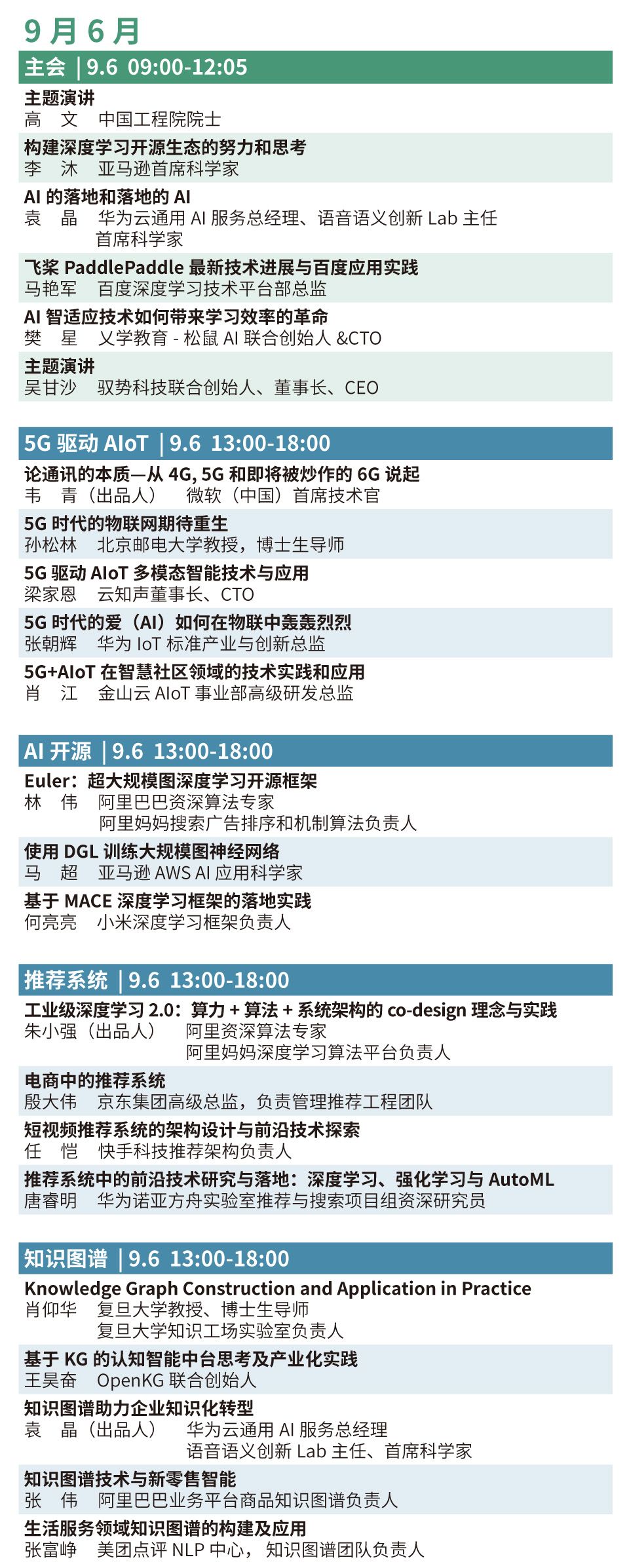 2019 年 9 月 6-7 日 是两日精彩大会。大会组委会不仅策划了嘉宾阵容强大的首日 Keynote,还专门为国内开发者设立了九大技术论坛,探秘机器学习、计算机视觉、自然语言处理、知识图谱、推荐系统、5G驱动 AIoT、AI 开源、AI+小程序和 AI+Devops 等核心技术与前沿趋势。从论坛定位、议题内容、Panel 环节的精心策划与严格把控,打造技术纯享论坛,为开发者筹备内容优质、干货满满的技术交流盛会。
