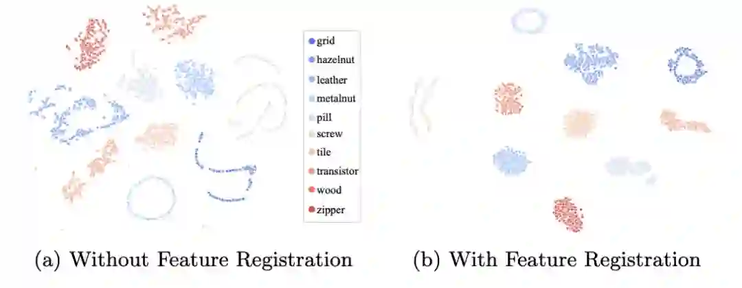 T-SNE 的可视化也显示出,基于配准的训练可以使得同类别的正常图像特征变得更加紧凑,从而有利于异常数据的检出。