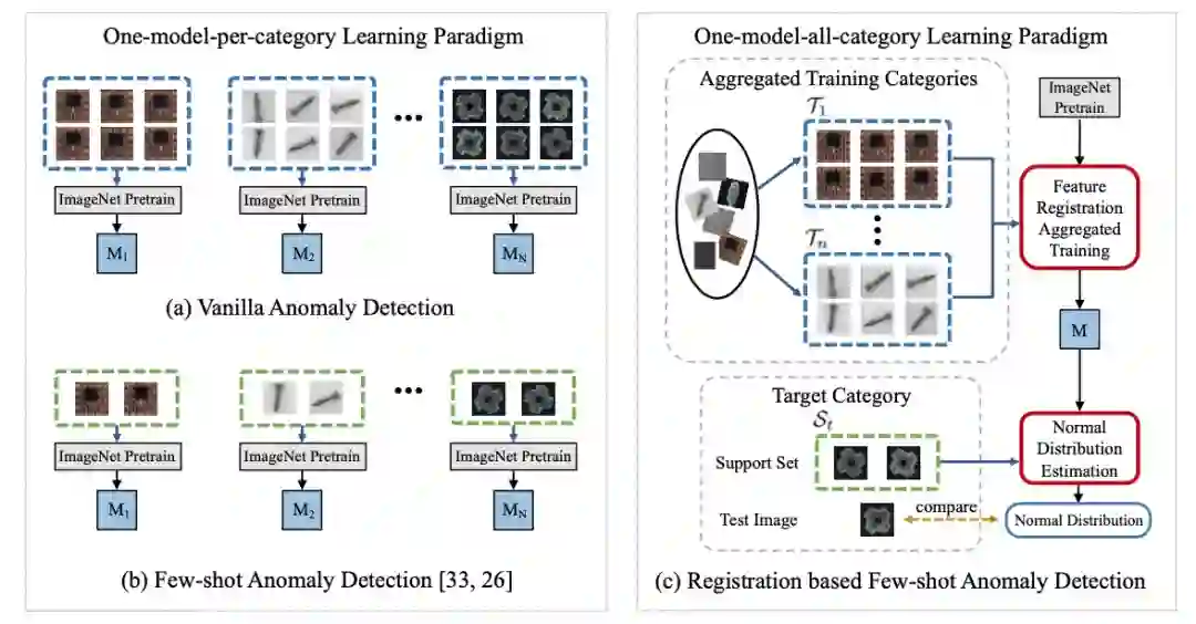 大多数现有的异常检测方法都专注于为每个异常检测任务训练一个专用模型。然而,在诸如缺陷检测之类的真实场景中,考虑到要处理数百种工业产品,为每种产品均收集大量训练集是不划算的。对此,上海交通大学 MediaBrain 团队和上海人工智能实验室智慧医疗团队等提出了一个基于配准的少样本异常检测框架,通过学习多个异常检测任务之间共享的通用模型,无需进行模型参数调整,便可将其推广到新的异常检测任务。目前,这项研究已被 ECCV2022 接收为 Oral 论文,完整训练代码及模型已经开源。