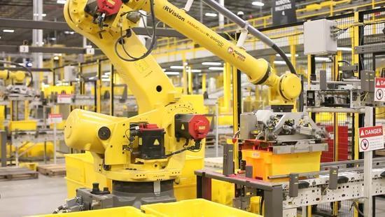 亚马逊的仓库里还有各样的机械臂,以新泽西佛罗伦萨仓库为例,8台机械臂在该仓库投入运作,那里大批量的商品被分成小批量,然后分发至全美各地的亚马逊配送中心。