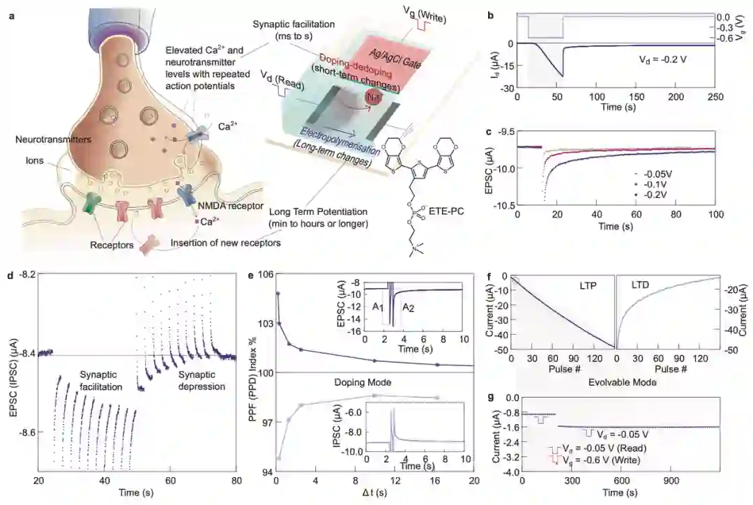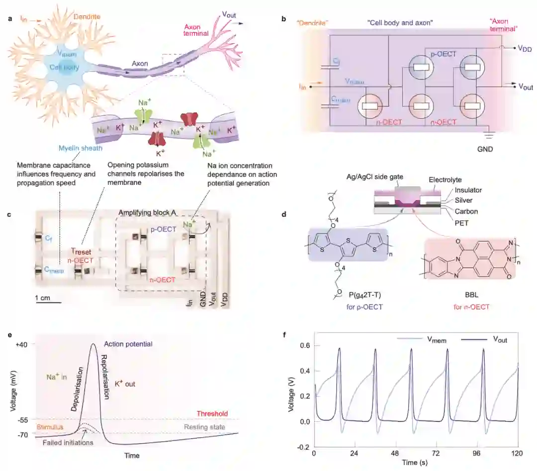 与 OFET 相比,OECT 可在相当低的电压(<1V)下工作,具有更高的跨导和良好的阈值电压稳定性,且通常具有高度的生物相容性,这些特性使 OECT 成为开发可印刷的、生物相容的人工尖峰神经电路的理想候选者,该电路具有离子介导的尖峰机制,与生物系统的信号特征非常相似。