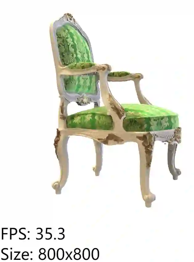 渲染的分辨率与训练的图像相同,800×800的合成图像,1008×756的正向图像,以及1256×828的无界图像,并且在chrome浏览器上测试所有的方法,并在一个完整的圈中旋转/平移相机,以渲染360个框架。