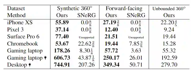 其中SNeRG由于其网格表示方法不同,无法表示无界的360°场景,并且由于兼容性或内存不足的问题,无法在手机或平板电脑上运行。