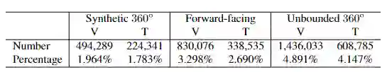 在多边形的计数中,可以看到MobileNeRF对每个场景产生的顶点和三角形的平均数量,以及与初始网格中所有可用顶点/三角形相比的百分比。由于MobileNeRF只保留了可见的三角形,所以在最终的网格中大部分顶点/三角形被移除。