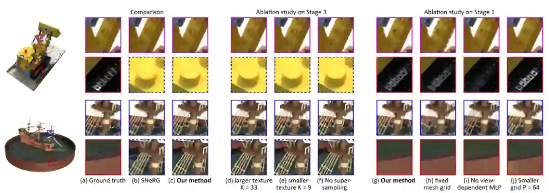 当摄像机处于适当的距离时,我们的方法实现了与SNeRG相似的图像质量。当相机被放大时,SNeRG倾向于呈现过度平滑的图像。