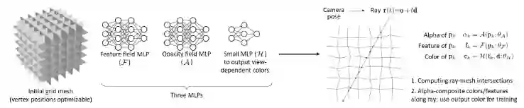 NeRF由一组纹理多边形(textured polygons)表示,其中多边形大致沿着场景表面排布,纹理图集存储不透明度和特征向量。