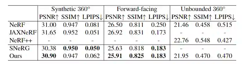 使用了三个数据集进行测试:NeRF的8个合成360°场景,LLFF的8个正面场景,以及Mip-NeRF 360的5个无界360°户外场景。