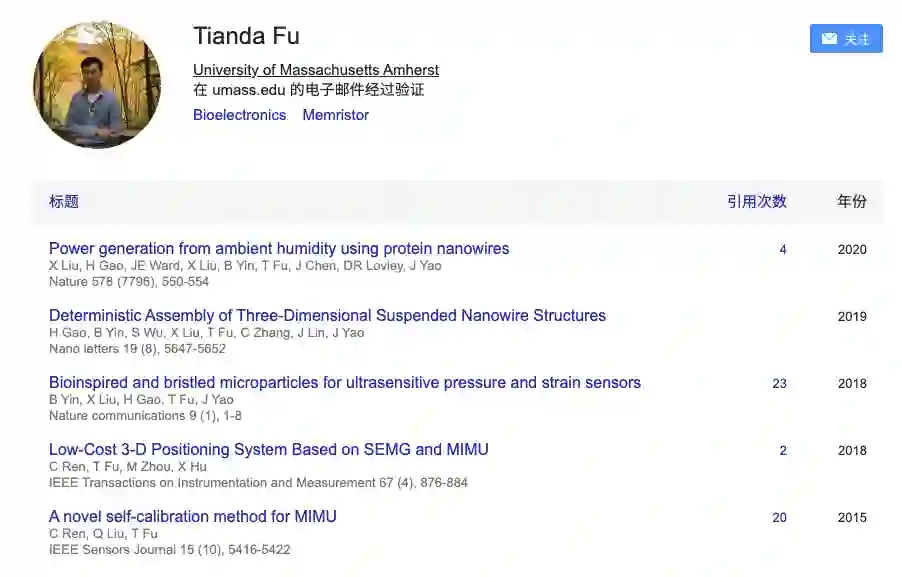 根据Google学术,他的研究方向是生物电子以及忆阻器。算上本次发布的论文,共计发表论文6篇,其中2020年有2篇发布在Nature上,一篇发布在Nature communications。