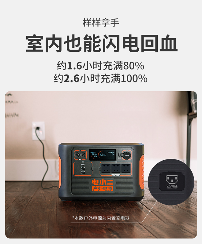 当然,电小二太阳能户外电源2200 也支持室内 220V 快充,充电速度更快,约 2.6 小时就能充满。旅行途中饭店吃个饭的功夫,就能让你拥有满满续航。