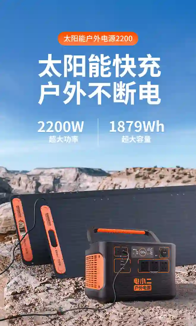续航方面,电小二太阳能户外电源2200 拥有 1.8 度多电且 2200W 超大功率,可满足 99.9% 的户外设备用电。