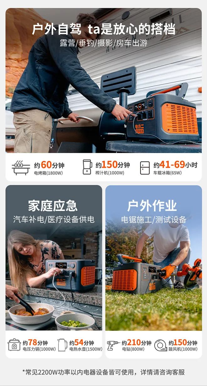 当然不止这么简单,电小二太阳能户外电源2200 还能为你的野外露营提供便利,可供 1800W 电烧烤 1 个小时,800W 电钻 210 分钟,手机 90 多次等。