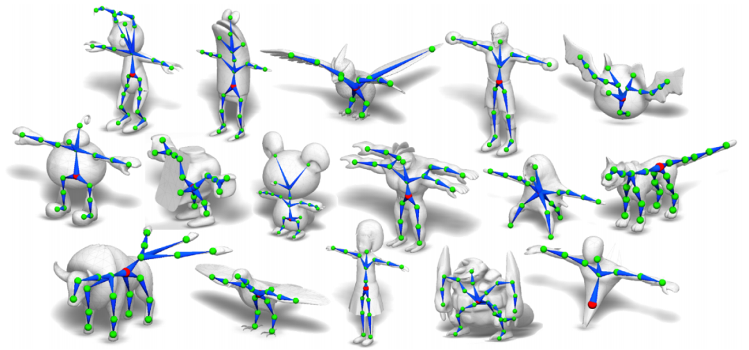 给出表示某个铰接式角色的 3D 模型作为输入,RigNet 能够预测角色的骨架,且骨架的关节位置和拓扑结构与动画师的预期相匹配。此外,RigNet 还可以基于预测的骨架估计蒙皮权重。