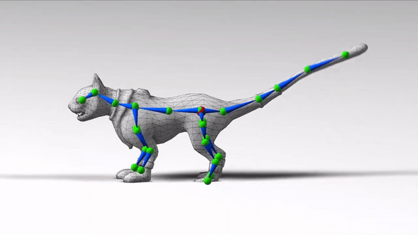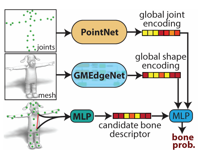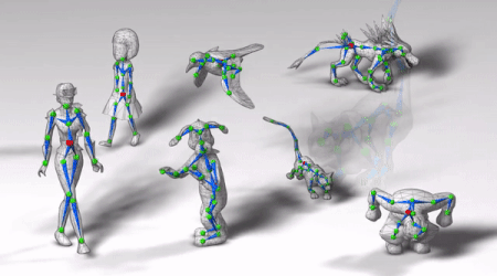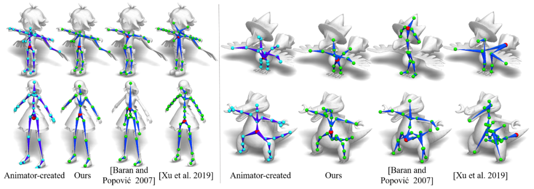 该方法基于深度架构构建而成,此架构可以直接在蒙皮(mesh)表征上运行,无需对形状类别和结构进行假设。该架构的训练数据包含大量不同的骨架绑定模型,及其蒙皮、骨架和对应的蒙皮权重。