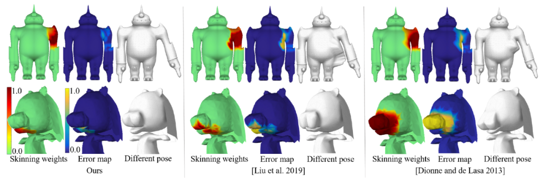 给定预测到的骨架(图 4f),该架构中的最后一个模块为每个蒙皮顶点生成权重向量,用以表示不同骨骼对顶点的影响程度(图 4g)。虽然该研究提出的方法受到 NeuroSkinning 的启发,但在架构、骨骼和形状表征、从顶点到骨骼的体积测地距离使用方面都有重要差别。
