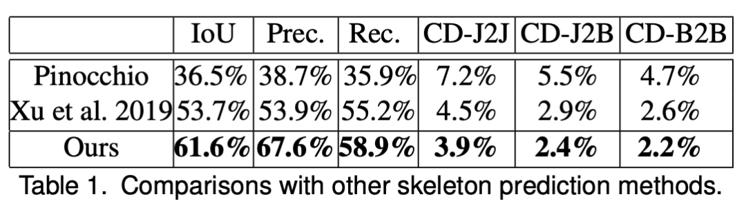 研究者对他们提出的方法与其他用于动画骨架和蒙皮预测的方法进行了定量和定性评估。下表 1 展示了不同方法之间骨架提取的评估度量。