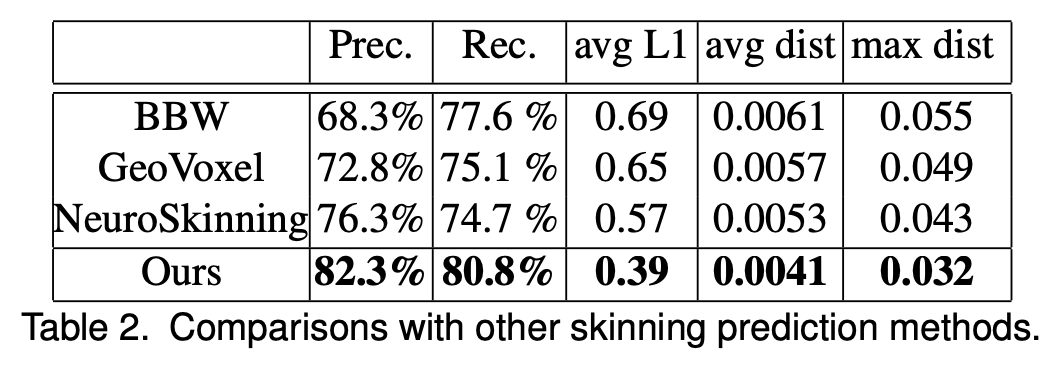 下表 2 展示了蒙皮的评估度量。结果显示,该研究提出的方法在所有度量上均优于 BBW、GeoVoxel 和 NeuroSkinning 方法。