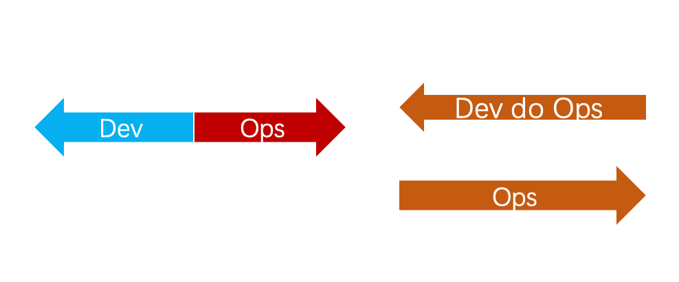 我经历过如下图简示的 Anti-Patterns,Dev 与 Ops 团队各行其是,或者简单的强制 Dev 团队独立完成 Ops 工作。