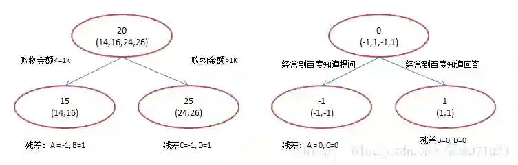在第一棵树分枝和图1一样,由于A,B年龄较为相近,C,D年龄较为相近,他们被分为两拨,每拨用平均年龄作为预测值。此时计算残差(残差的意思就是: A的预测值 + A的残差 = A的实际值),所以A的残差就是16-15=1(注意,A的预测值是指前面所有树累加的和,这里前面只有一棵树所以直接是15,如果还有树则需要都累加起来作为A的预测值)。进而得到A,B,C,D的残差分别为-1,1,-1,1。