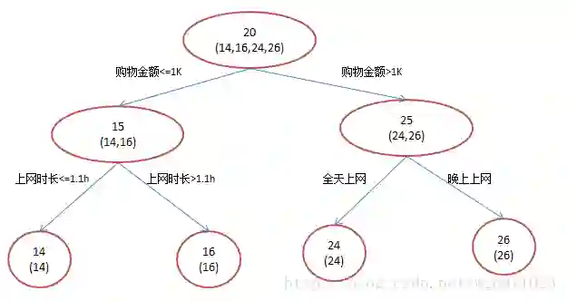 分枝直到每个叶子节点上人的年龄都唯一(这太难了)或者达到预设的终止条件(如叶子个数上限),若最终叶子节点上人的年龄不唯一,则以该节点上所有人的平均年龄做为该叶子节点的预测年龄。