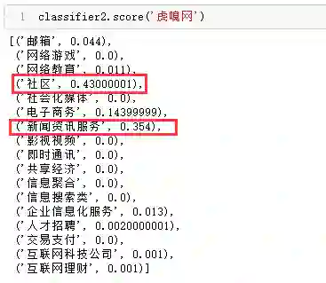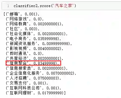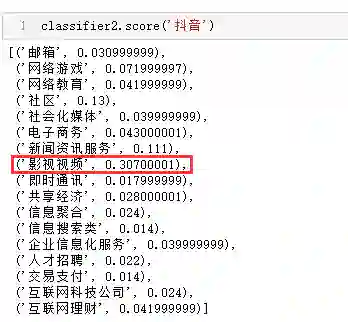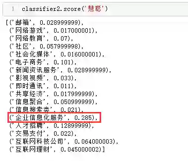 接着,笔者用之前未出现在训练语料中的词来检验效果,出来的结果是类别标签及其对应的概率,概率值大的类别是品牌最有可能从属的细分领域。结果如下图所示: