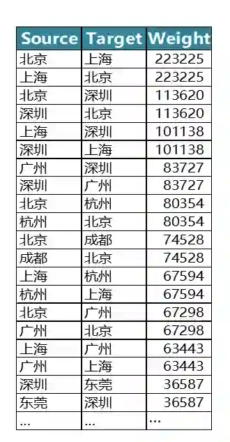 接下来,笔者将抽取文本中城市之间的共现关系,也就是城市之间两两同时出现的频率,在一定程度上反映出城市间经济、文化、政策等方面的相关关系,共现频次越高,说明二者之间的联系紧密程度越高,抽取出的结果如下表所示: