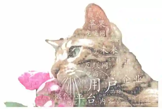 笔者选取TOP500关键词来绘制关键词云。因为虎嗅的名字来源于英国当代诗人Siegfried Sassoon的著名诗句“In me the tigersniffs the rose(心有猛虎,细嗅蔷薇),所以词云以“虎嗅蔷薇”为背景,找不到合适的虎嗅蔷薇的画面,于是用它的近亲猫作为替代,词云如下: