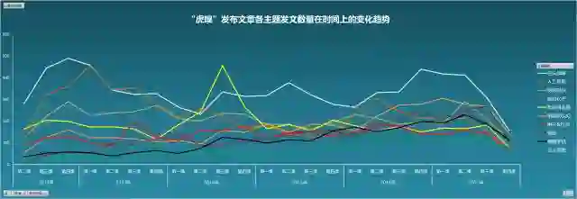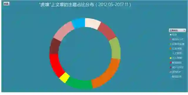 以下是上述各个话题在这4W多篇文章中的占比情况,可以明显的看出,虎嗅首页上的文章对互联网行业各大巨头的行业动向报道较多,其次是不断崛起的影视娱乐,除了无人驾驶方面的报道偏少以外,其他主题方面的文章的报道量差异不大,比较均衡。