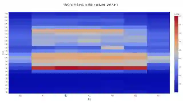 笔者从时间维度里提取出“周”和“时段”的信息,也就是开题提到的“人工特征”的提取,现在做文章分布数量的在“周”和“时”上的交叉分析,得到下图: