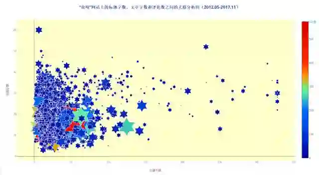 首先,笔者做出了标题字数、文章字数和评论量之间的气泡图(圆形的气泡被六角星替代,但本质上还是气泡图)。