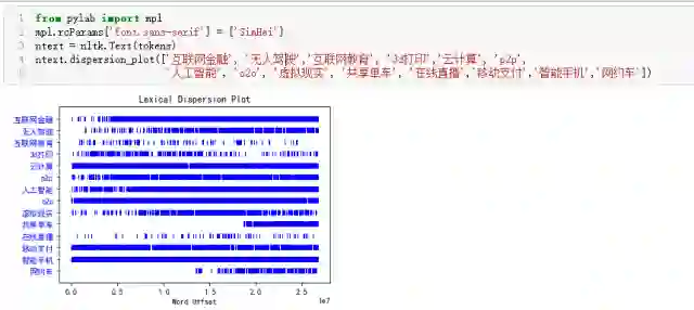 接下来,笔者想了解虎嗅网主页这4W+文章中的某些词汇在2012.05~2017.11之间的数量分布和他们的位置信息(the locationof a word in the text),这时可以利用Lexical dispersion plot(词汇分散图)进行分析,它可以揭示某个词汇在一段文本中的分布情况(Producea plot showing the distribution of the words through the text)。