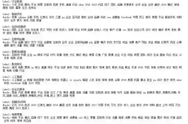 在这里,笔者根据互联网企业所属细分领域的不同,划分为17个类别,每个类别只有很少的标注语料参与训练,也就是几个词罢了。对,你没看错,借助外部语义信息(之前训练好的词向量模型,已经包含有大量的语义信息),你只需要少许的标注语料就可以完成分类模型的训练。
