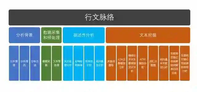本文的文本挖掘部分主要涉及高频词统计/关键词提取/关键词云、文章标题聚类、文章内容聚类、文章内容LDA主题模型分析、词向量/关联词分析、ATM模型、词汇分散图和词聚类分析。