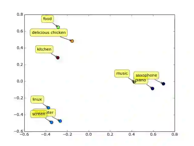 运用基于Word2Vec(词向量)的K-Means聚类,充分考虑了词汇之间的语义关系,将余弦夹角值较小的词汇聚集在一起,形成簇群。下图是高维词向量压缩到2维空间的可视化呈现: