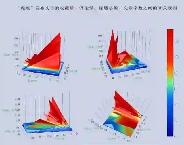 接下来,笔者将收藏量、评论量和标题字数、文章字数绘制成一张3D立体图,X轴和Y轴分别为标题字数和正文字数,Z轴为收藏量和评论量所构成的平面,通过旋转这个3维的Surface图,我们可以发现收藏量、评论量和标题字数、文章字数之间的相关关系。