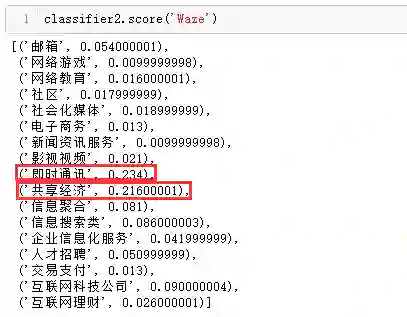 通过Google,笔者了解到Waze是以色列一家做众包导航地图的科技公司。前一段时间火了一把,被Google 10亿美元收购了。其产品虽然没有Google地图那样强大的卫星图片作支撑,但是可以向用户社区提供有关交通状况、交通事故以及测速区等实时信息(地图弹幕即视感)。“众包”和“实时信息”分别对应“共享经济”和“即时通讯”,比较符合预测标签所表征的内涵,能在一定程度上预测出该企业的业务属性。