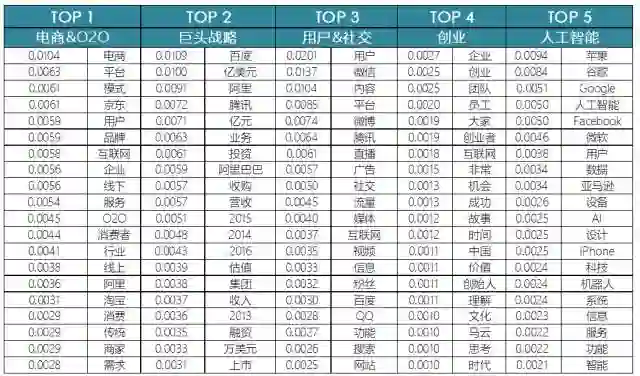 创业、商业模式类:模式、创新、业务、运营、流量、员工等。