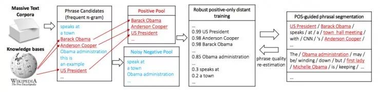 这项工作主要是对语料库文本的Topic 进行挖掘。但是它的方法不同于以往采用 Uni-gram 的方法,而是将 Topic 挖掘分成了两个步骤:通过 Phrase Mining 对文本进行分割;随后进行基于 Phrase 约束的 Topic 模型。