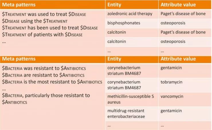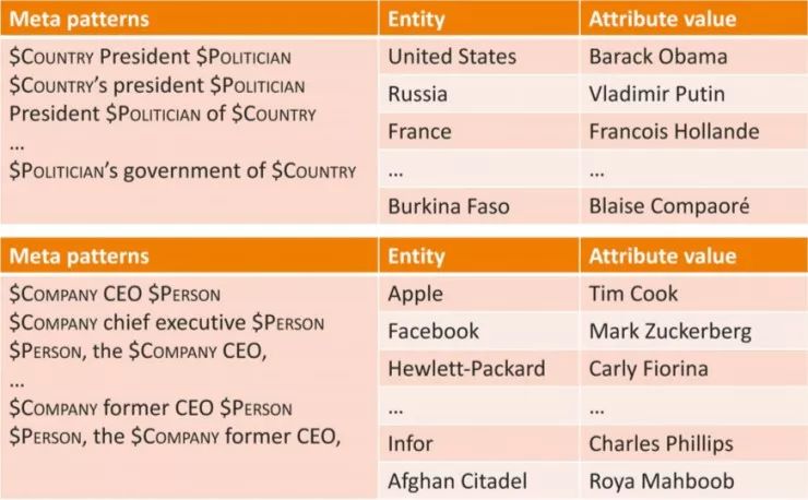 同样的,这对机器来说也并不难。只要有 Pattern,机器可以迅速地从文本中挖掘出相同 Pattern 的大量信息。韩家炜举了他们实验室读博士后的蒋朦在KDD 2017 上发表的文章。