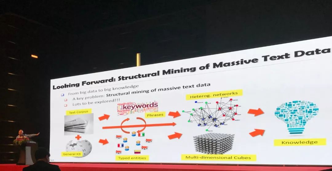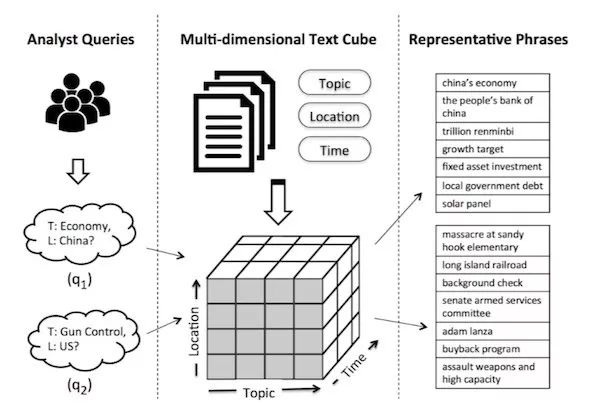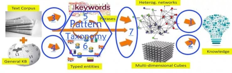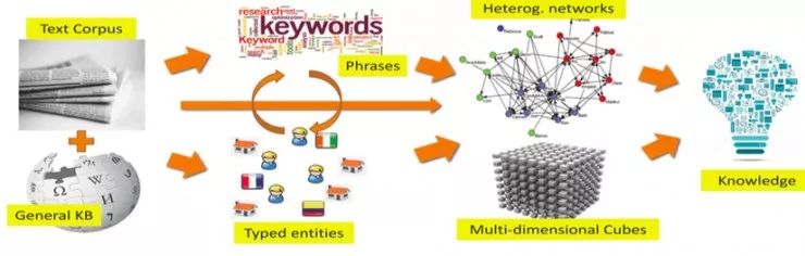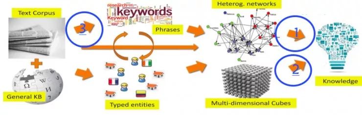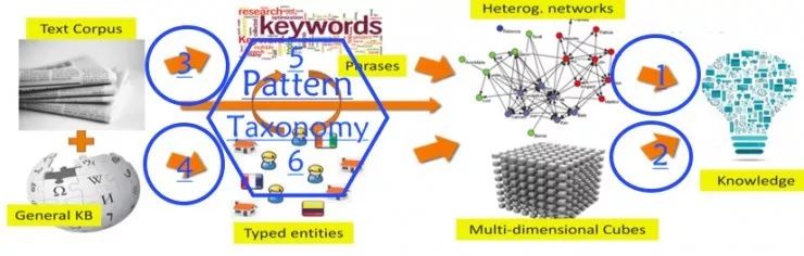 韩家炜团队的人员近几年主要的研究工作正是围绕着这个问题进行的,即怎样从 Text 中挖掘 Phrases、怎样从 Text 中挖掘 Typed Entities、以及怎样把这些 Phrases/Typed Entities 变成 Network/Text-cube。