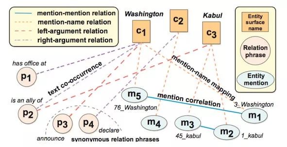 韩家炜讲了他们发表在 KDD 2015 上的一篇文章。在这篇文章中他们构建了如下一张异质结构图,其中c1、c2、c3 代表实体的 Surface Name,p1、p2……代表文本中 Surface Name 左右的 Phrase,而 m1、m2 ……代表实体(EntityMention)。每个 Entity Mention 都是没有歧义的独立对象。