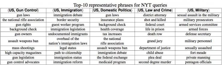 使用这种方法,韩家炜领导的小组通过 NY Times 在 2016 年的新闻很容易就挖掘出了当时美国两党辩论过程中的主要议程(例如<US, Gun Control>、<US,Immigration>等)Top 10 的关键信息。