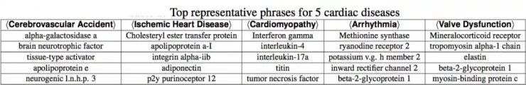 讨论过后,韩家炜等人从 PubMed(一个医学文献库)中抓取了「心血管疾病」相关的十年的数据,大约有 50 万篇 paper。他们使用这 50 万篇paper、6 类心脏病以及医学教授们列出的 250 种蛋白质,根据和挖掘 NY Times 一样的算法,很快就得到了针对每一类心脏病的相关蛋白质排序,如下表(仅列出 Top 5)。