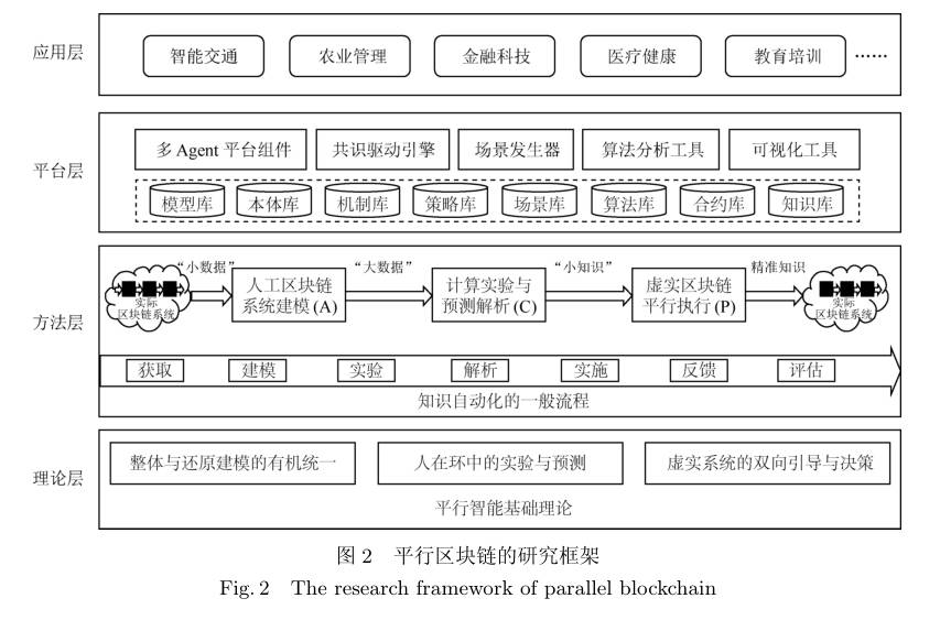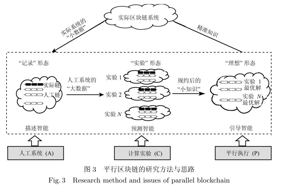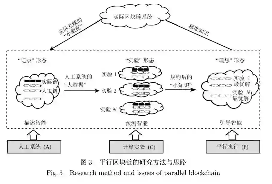 区块链系统是典型的分布式多智能体系统。因此,平行区块链遵循复杂性科学中自下而上的研究方法,通过ACP方法中基于人工系统的区块链建模、基于计算实验的预测解析和基于平行执行的引导决策,来实现区块链系统的“描述+预测+引导”平行智能。