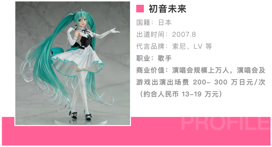 据日本经济新闻报道,初音未来在 2007- 2012 年,带动了超过 100 亿日元(约合人民币 6.32 亿元)的消费市场,到 2017 年,仅仅一年就创造了 100 亿日元的市场。同时,她在国内商业领域也做得风生水起。