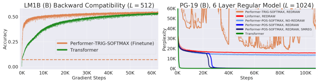 将原始的经过预训练的 Transformer 的权重转移到 Performer 中,Performer 产的精度达到 0.07 (橙色虚线),但在原来的梯度步数的一小部分中,很快就恢复了精度。