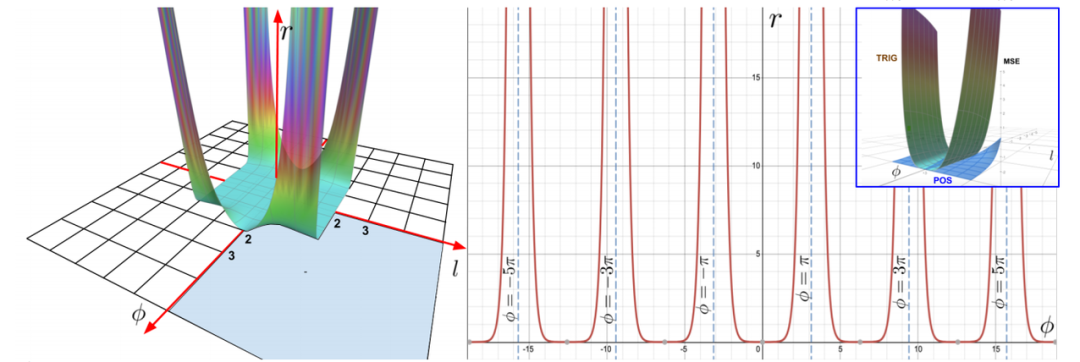 图 | 原点对称的通用函数 r(定义为建立在:三角随机特征和正随机特征上的估计器的均方误差(MSEs)的比值)是输入特征向量与其长度l之间的角度 φ(以弧度为单位)的函数, 函数的数值越大表示正随机特征性能越好的(φ,l)空间区域(左);当 l 为定值 1 时,与变化的角度 φ 构成的函数 r 为正切函数,以及