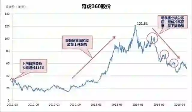 长江商学院案例中心特意研究了 360 上市后业绩和股价的关系:2014 Q1 之后,每个季度,360 都拿出了靓丽的财报,但股价在冲起来后却呈现出下跌的趋势。