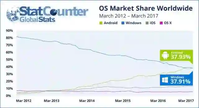 PC 互联网和移动互联网呈现出一边倒的此消彼长,2017 年 3 月,Android 操作系统正式超越 Windows,成为用户上网的第一大操作系统。