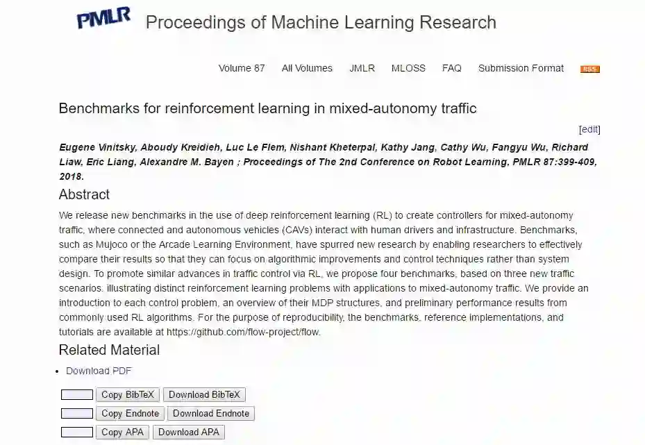 这些基准会作为Flow工具项目的一部分,这个项目用于在交通模拟器SUMO和AIMSUN中将控制和强化学习(使用RLlib 和rllab作为强化学习库)应用于自动驾驶车辆和交通灯。这些基准中获得高分意味着实际拥塞指标的改进,例如平均行驶速度,道路系统总延迟和道路吞吐量。通过在这些基准上取得的进展,希望可以回答有关AV应用的基本问题,并给出现实世界中部署可改善拥塞的AV的路线图。