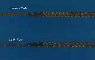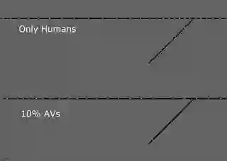 在完全人类驾驶的情况下,车辆紧密地跟随,当匝道上的车冲入主道时,后面的车辆需要急踩刹车,导致“车辆聚集”。然而,在存在AV的情况下,自动驾驶车辆在接近匝道入口时加速从而拉开了与后面车辆之间的距离。较大的距离会形成缓冲区,因此当匝道上车辆进入主道时,主道上的车只需轻踩刹车就可避让开。